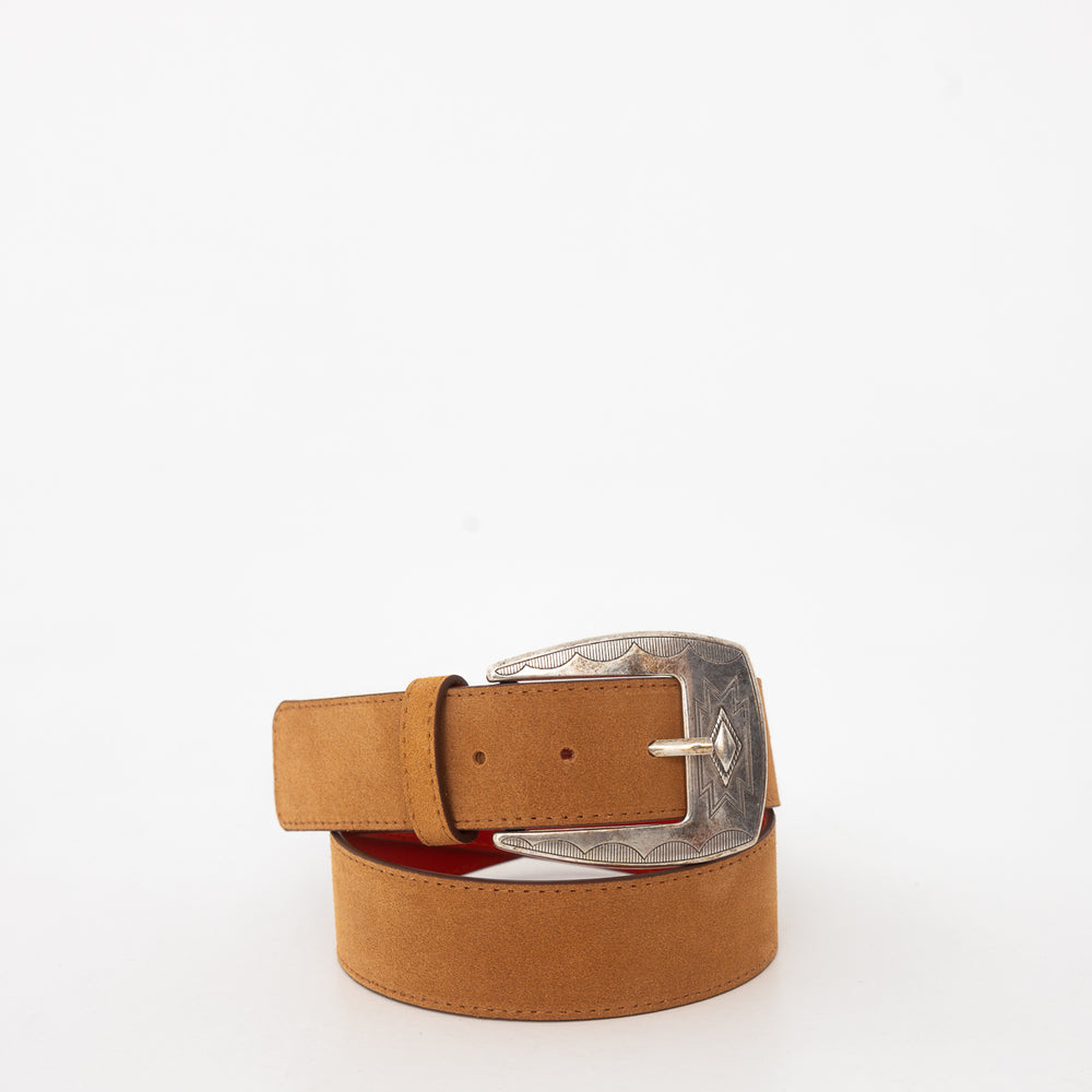 Cinturón de piel de serraje color whisky con lujados pintados a mano y pespuntes a tono. Pasador en misma piel de serraje a tono con mismos lujados y pespuntes. Forro interior en piel de vacuno lisa color naranja. Hebilla en níquel.