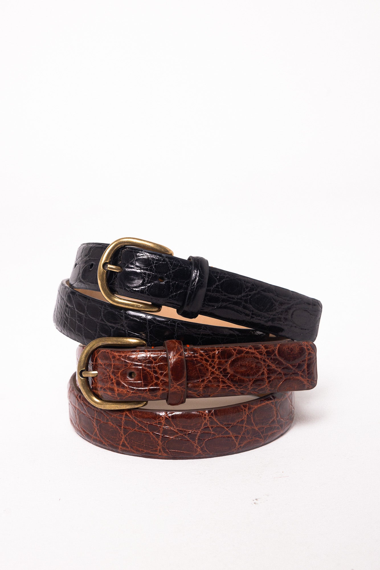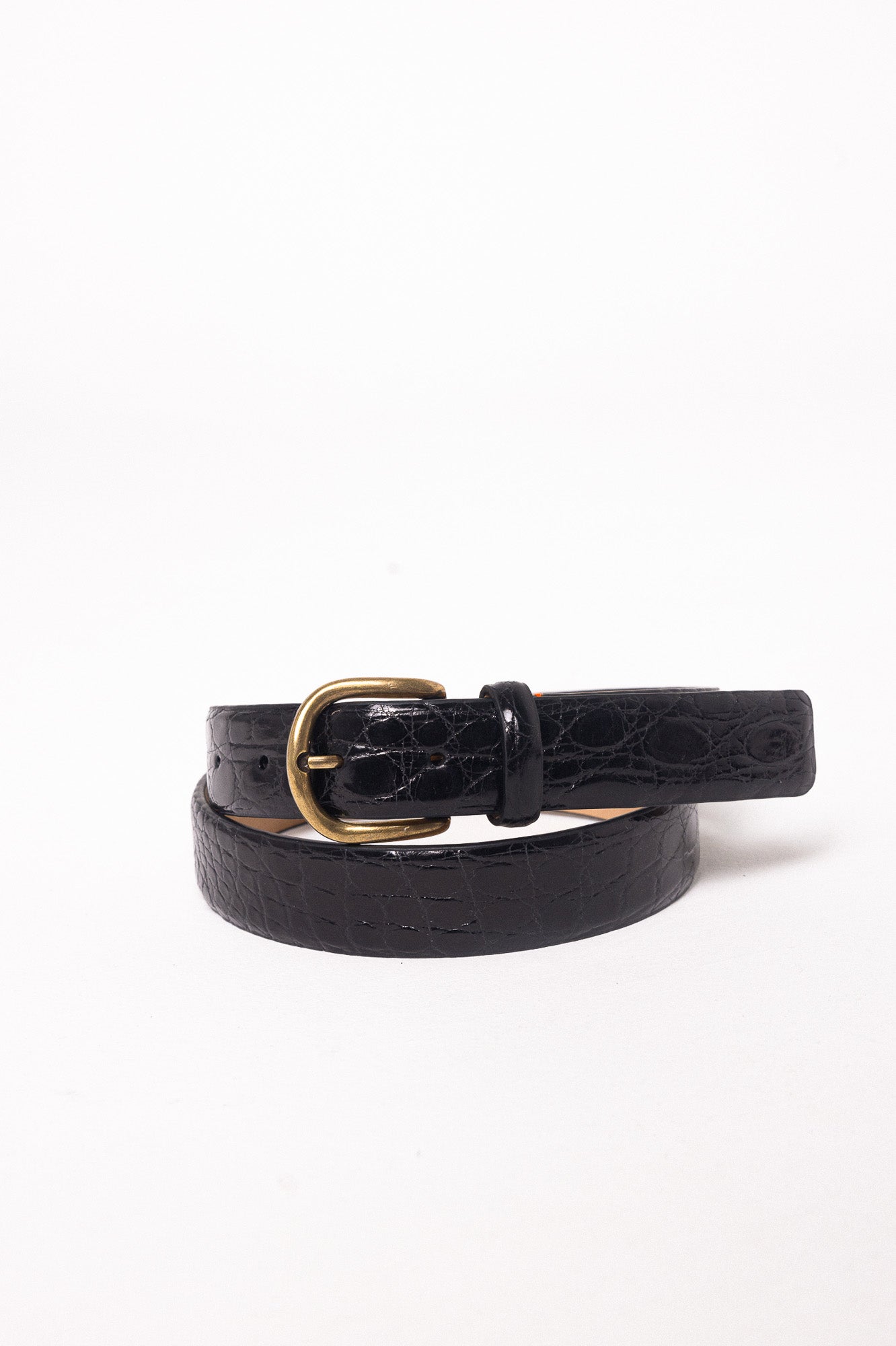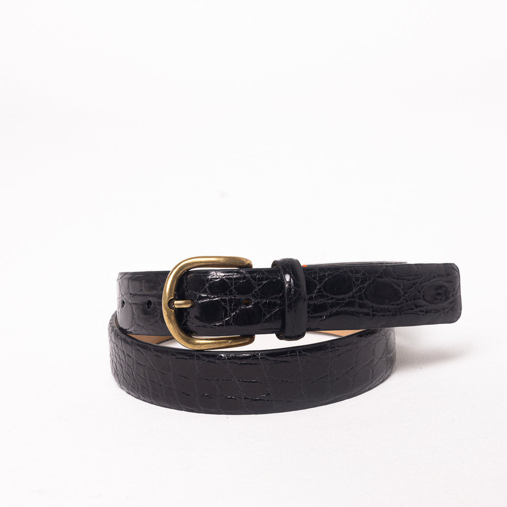 Cinturón en flanco de cocodrilo con hebilla en oro viejo y forro en piel nobuk. Disponible también en color cognac.