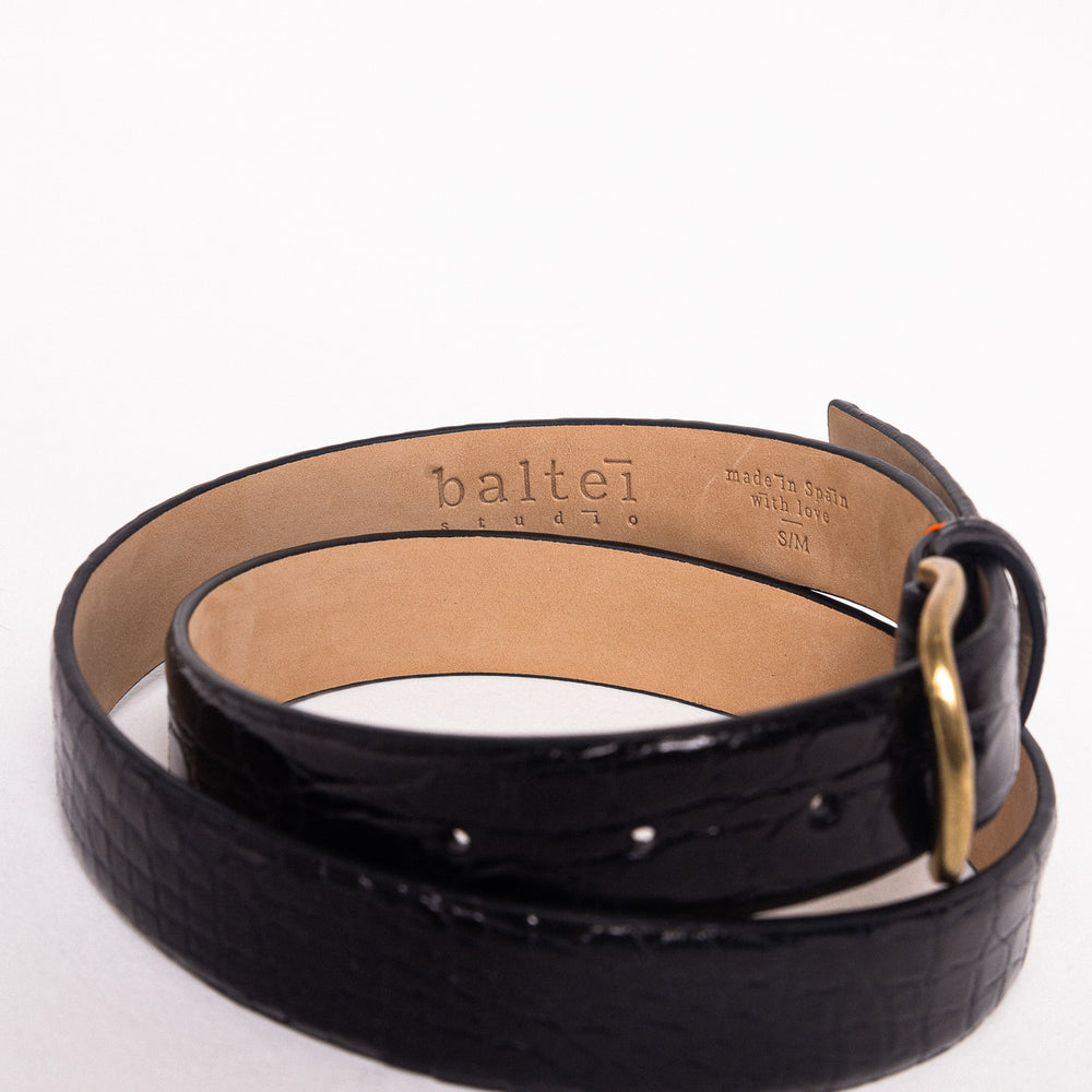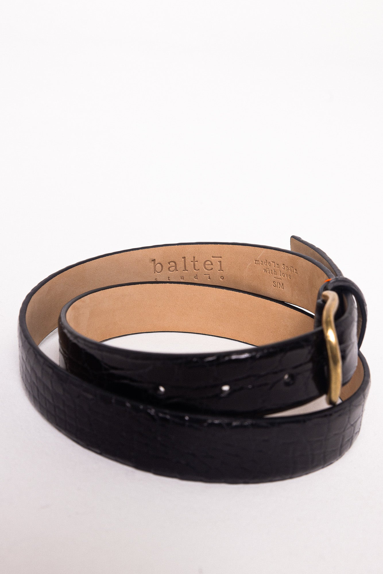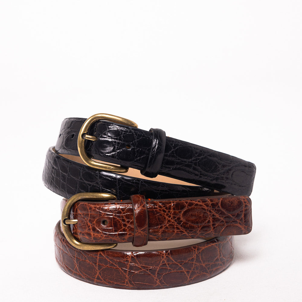 Cinturón en flanco de cocodrilo con hebilla en oro viejo y forro en piel nobuk. Disponible también en color cognac.