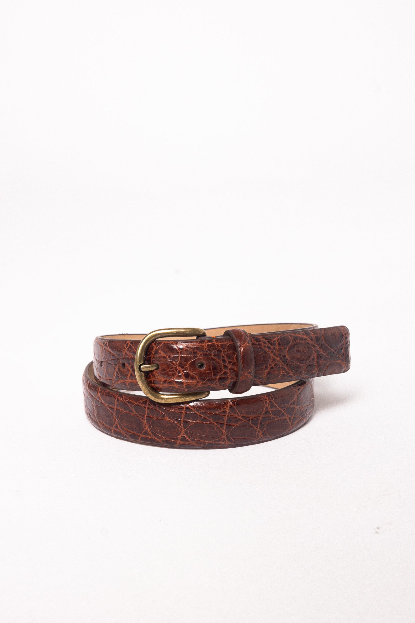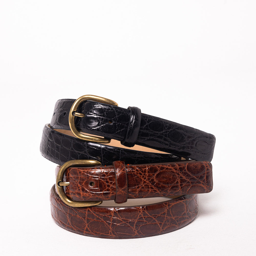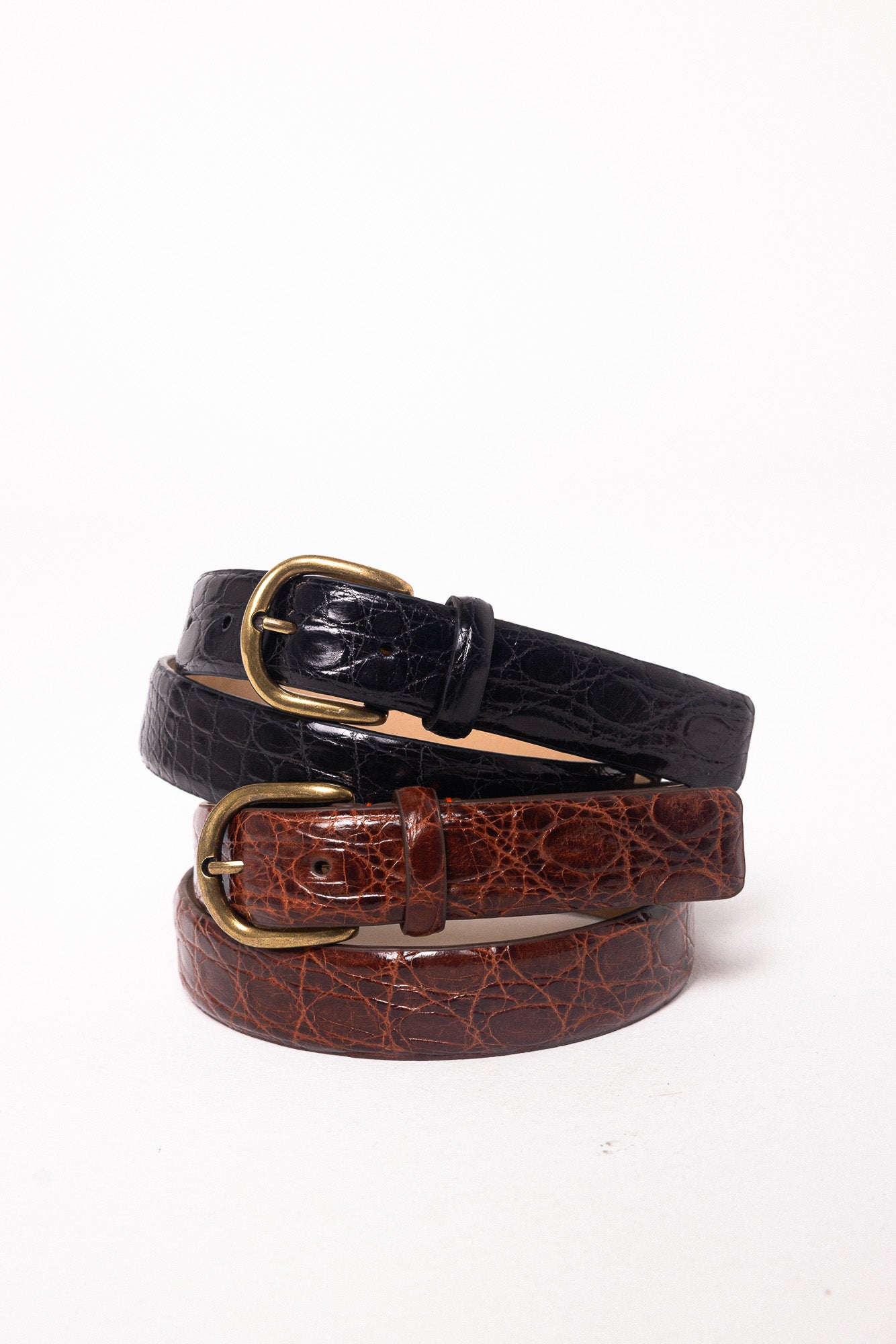 Cinturón en flanco de cocodrilo con hebilla en oro viejo y forro en piel nobuk. Disponible también en color negro.