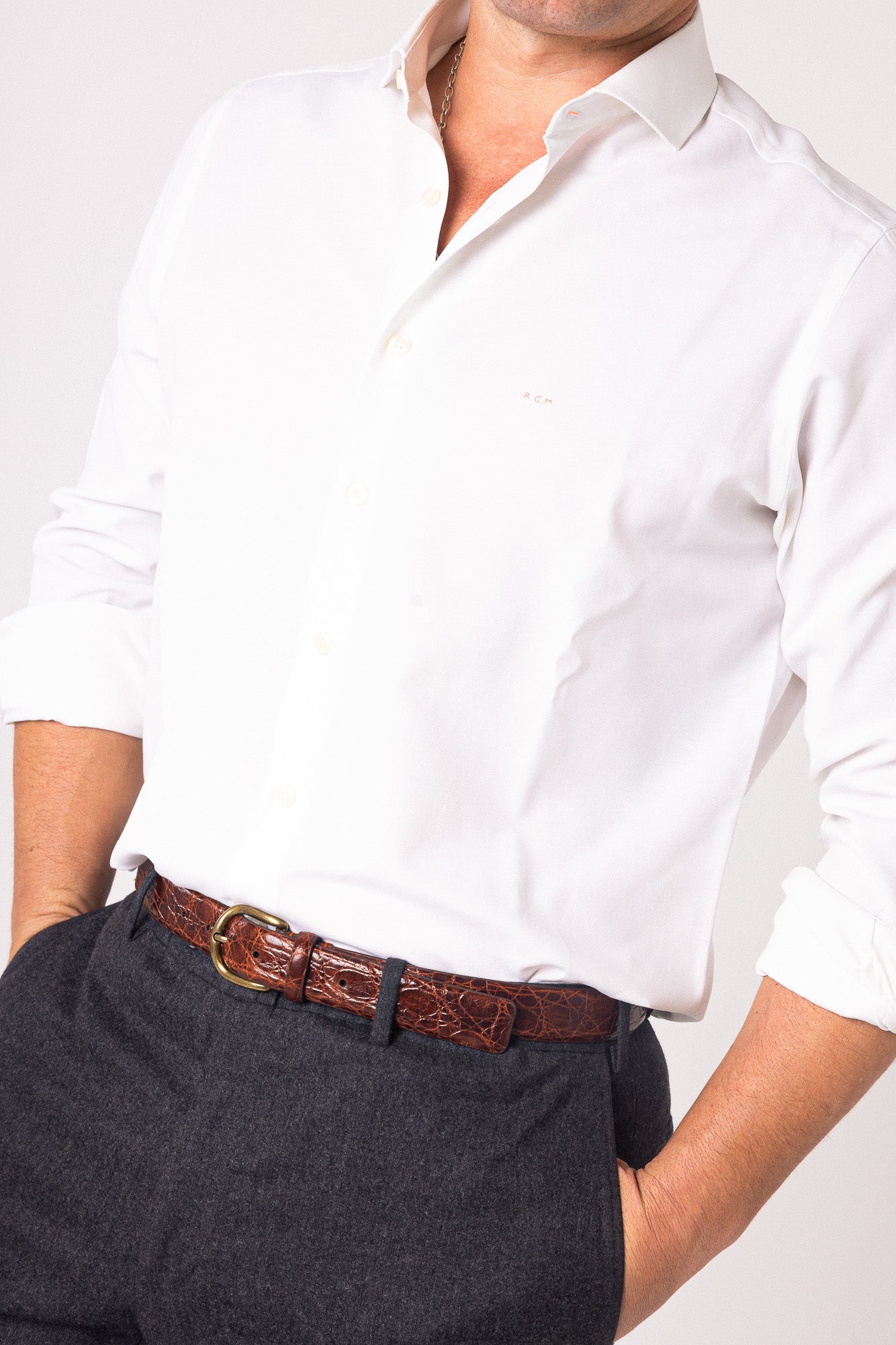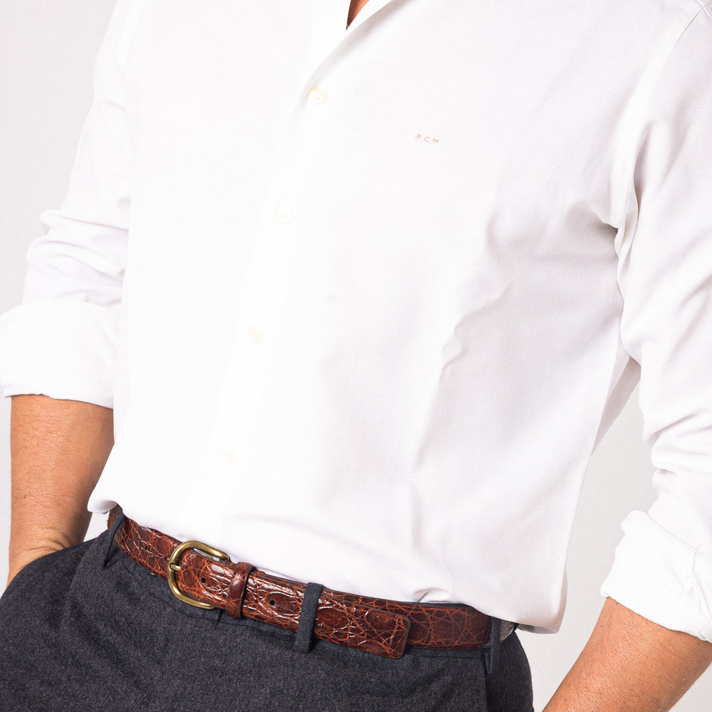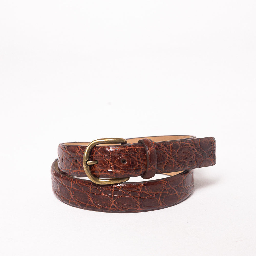 Cinturón en flanco de cocodrilo con hebilla en oro viejo y forro en piel nobuk. Disponible también en color negro.