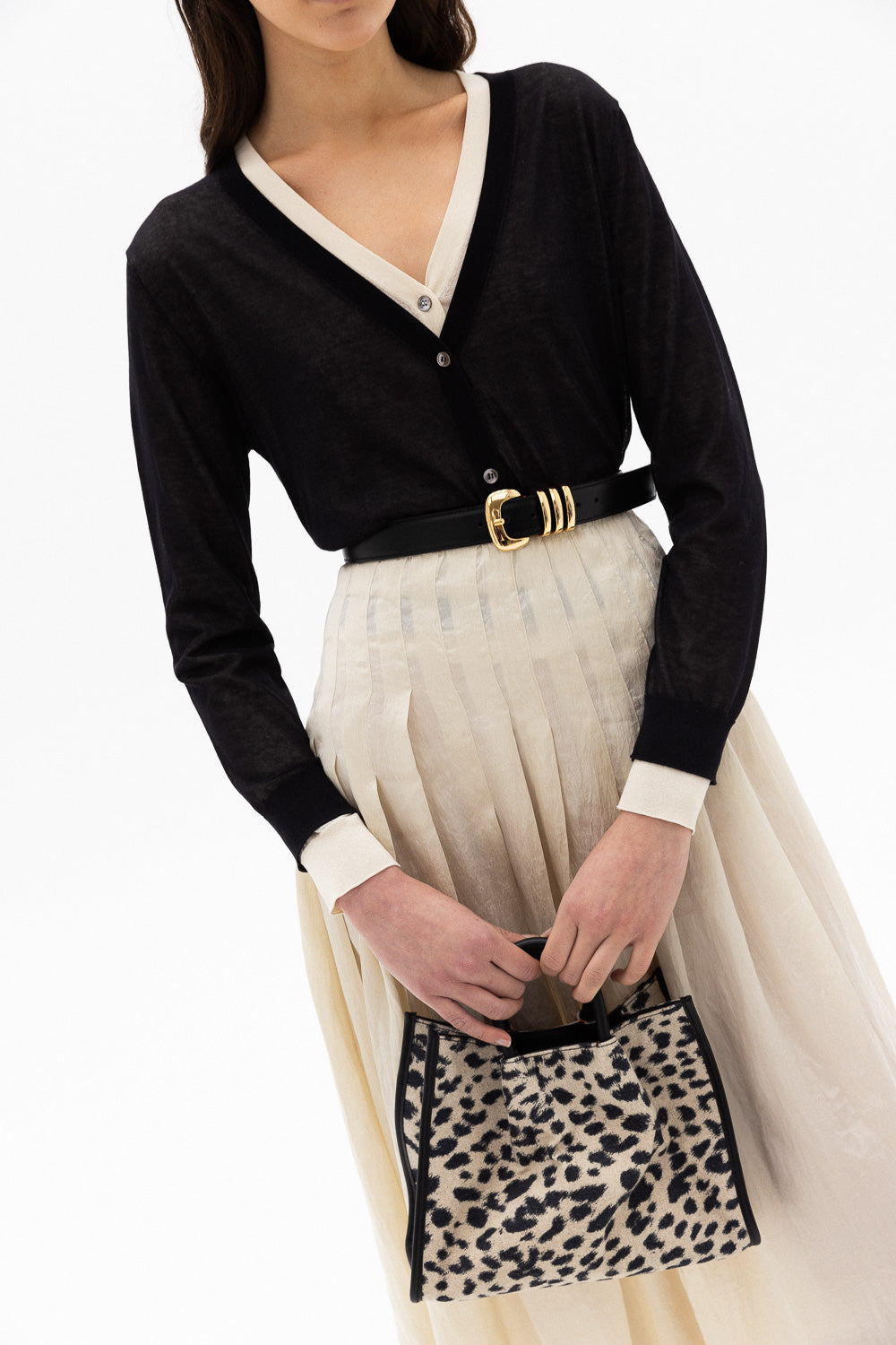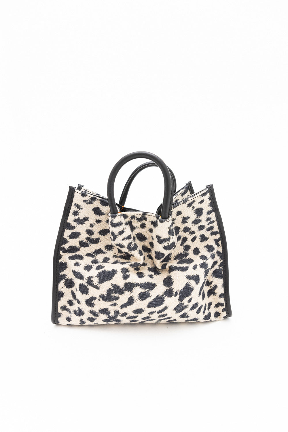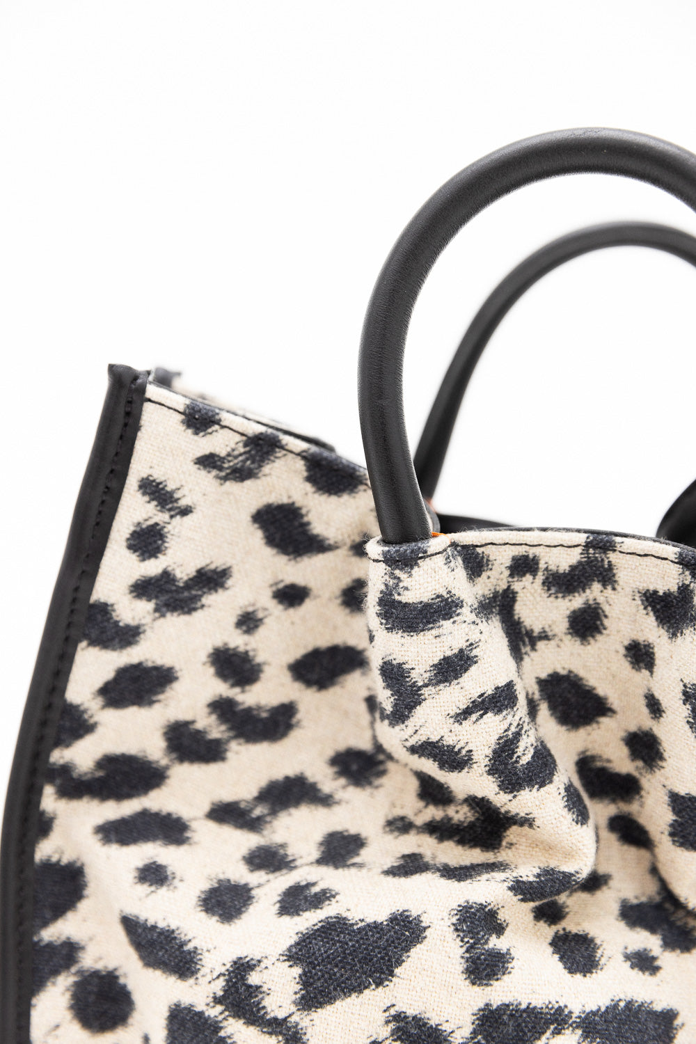 Bolso animal print de algodón orgánico natural con asas tubulares de piel de vacuno color negro cosidas a mano de forma artesanal, además de asa larga de piel a modo bandolera. 100% fabricado en España.