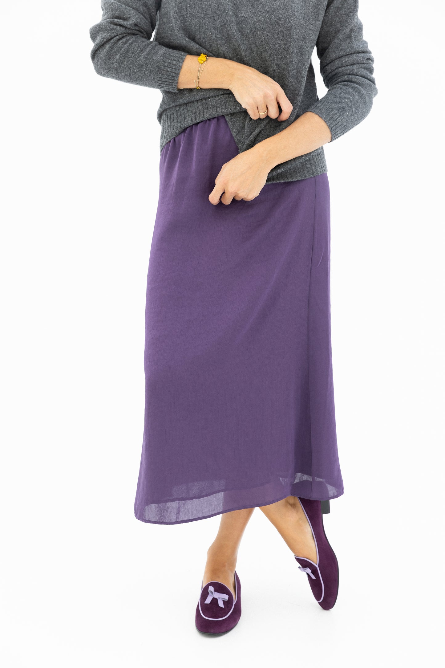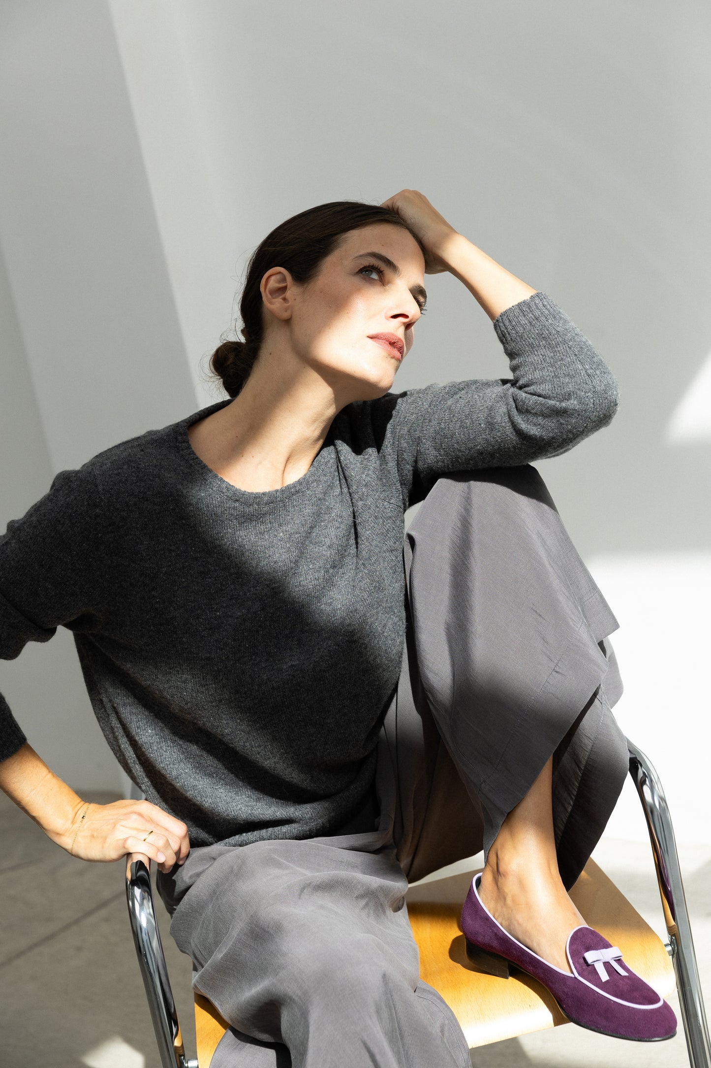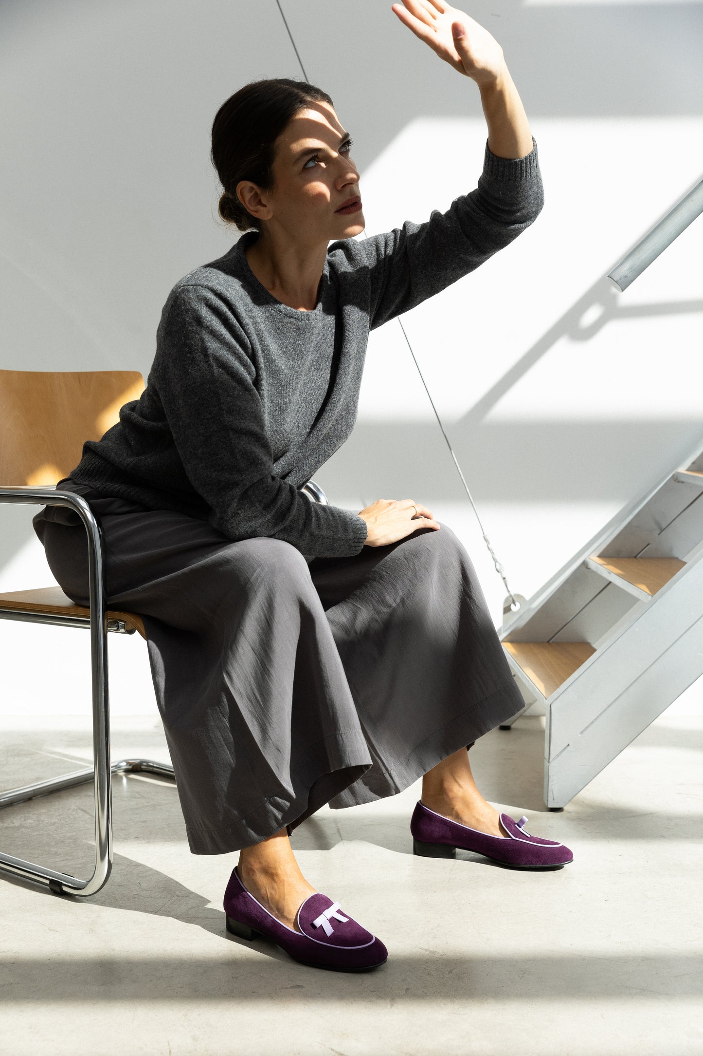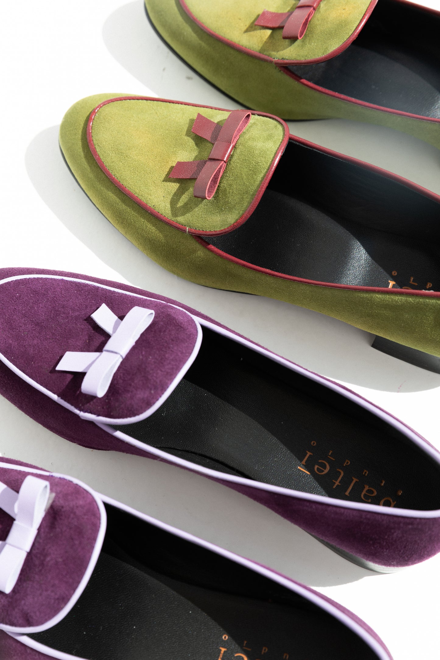Mocasín en ante color morado oscuro con lazo y vivo en piel lisa color lila clarito.