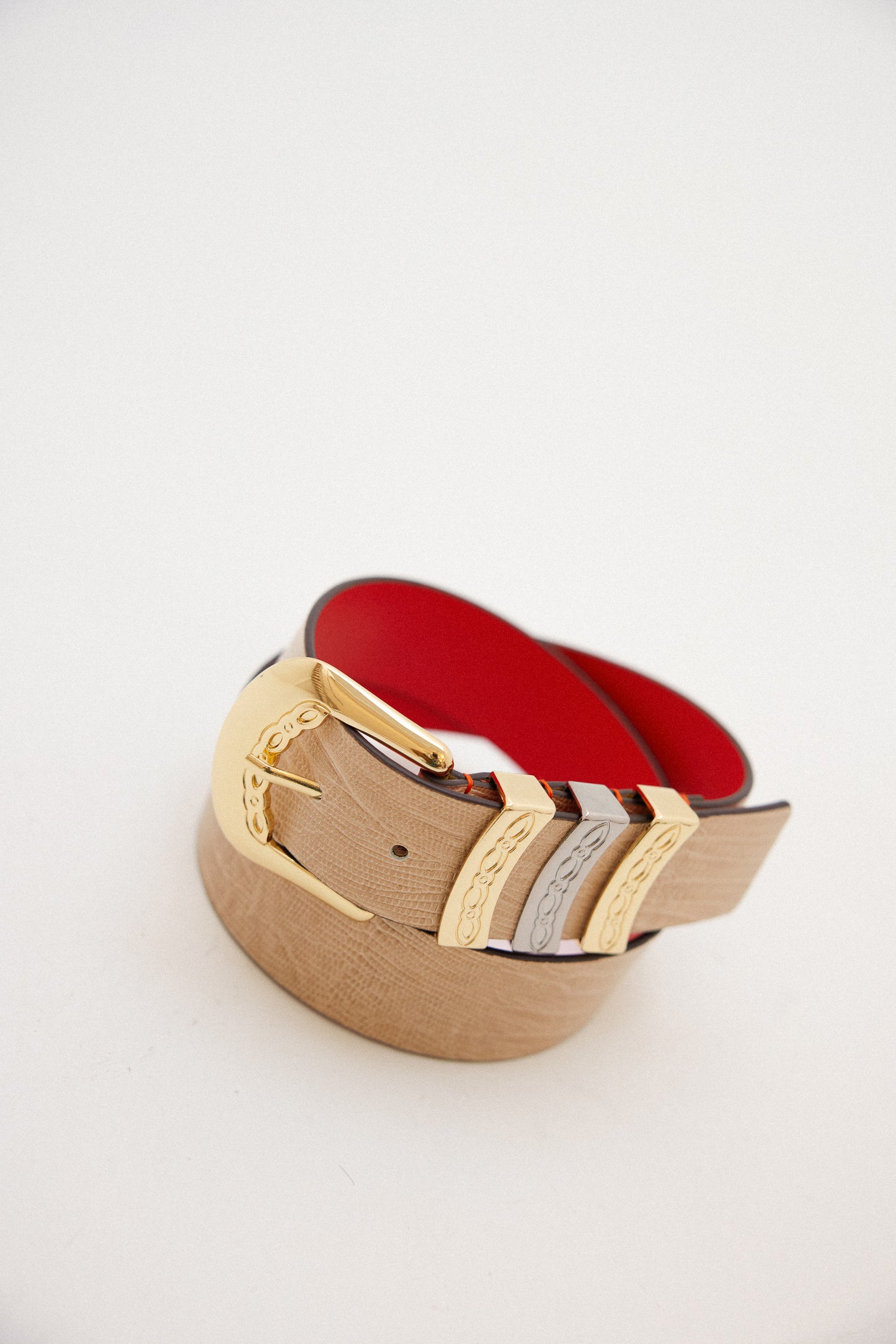 Natural cowhide leather with tejus engraving treated in Spain with buckle and two gold-plated pins combined with a nickel pin.