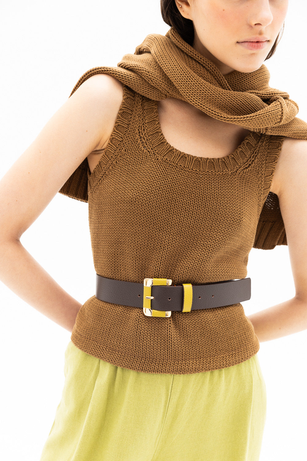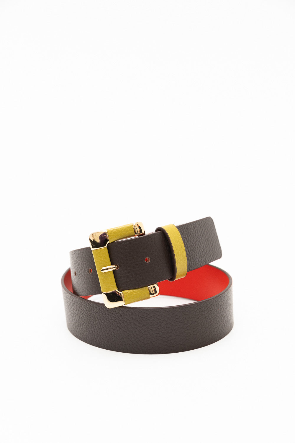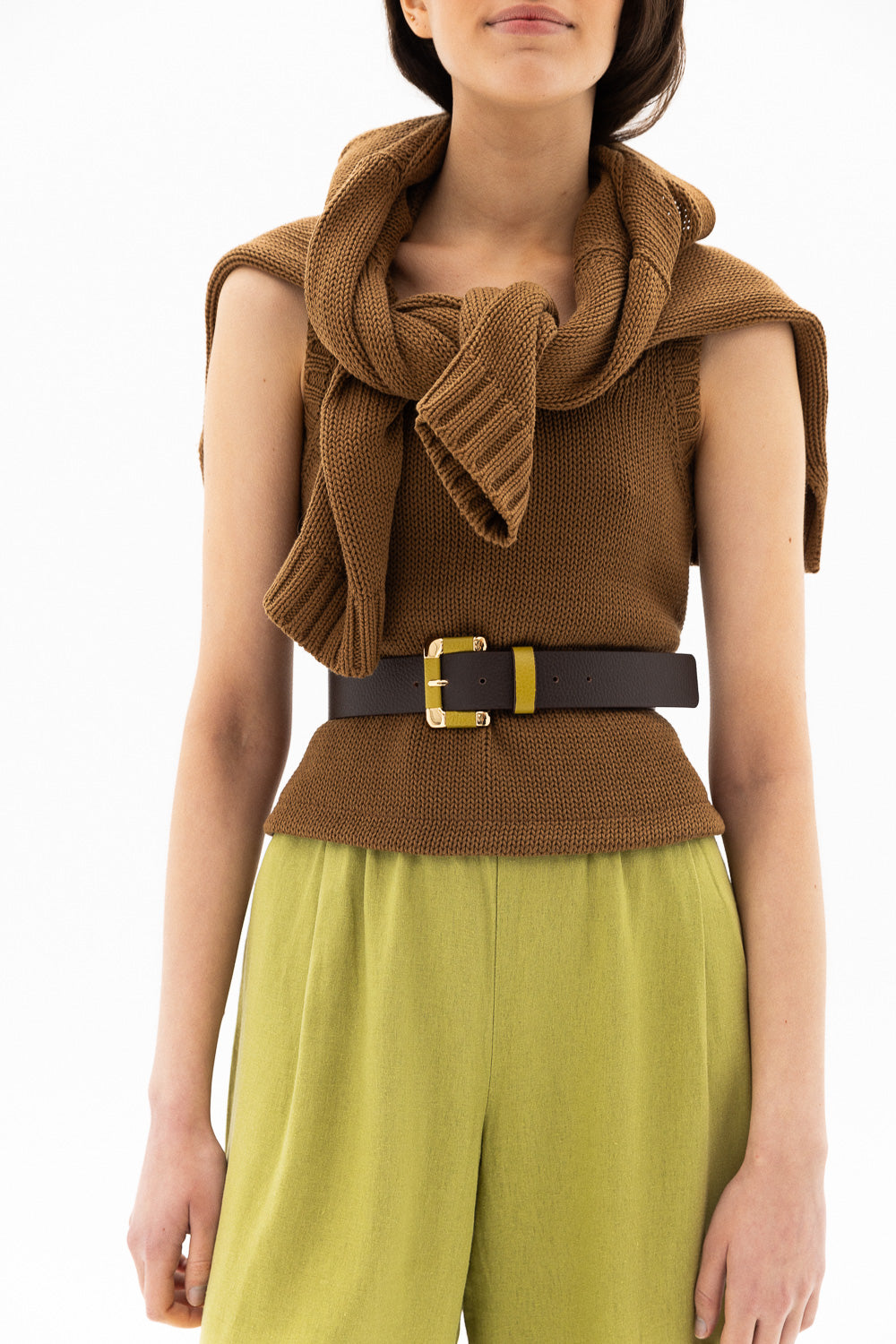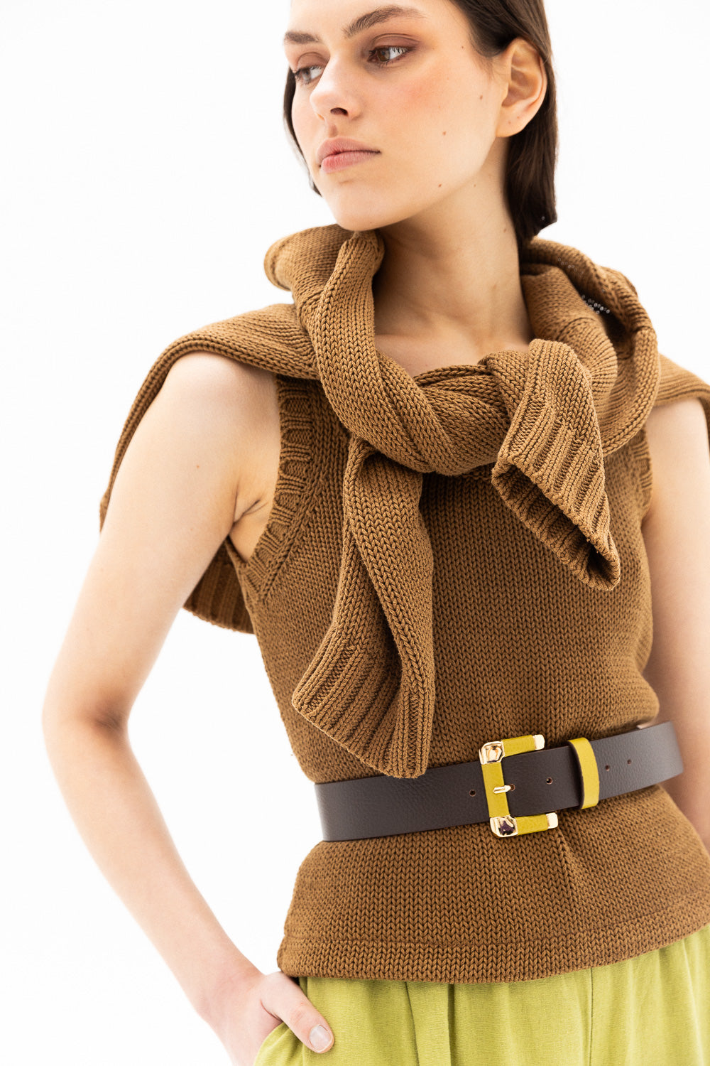 Color: Marrón chocolate con hebilla y pasador en verde pistacho.